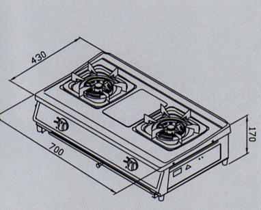 名稱:台面放置爐機體尺寸:700*430*212(含爐架)顏色/材質:烤漆/不銹鋼點火方式:免電池,壓轉式點火瓦斯消耗量:LPG共10.5KW(0.74kg/h) NG共10.5KW(9093kcal/h)價格不包含安裝費 安裝費另計詳細說明:1.三環大火適合快炒2.熄火安全裝置3.兒童安全鎖4.專利清潔盤5.國家認證節能商品