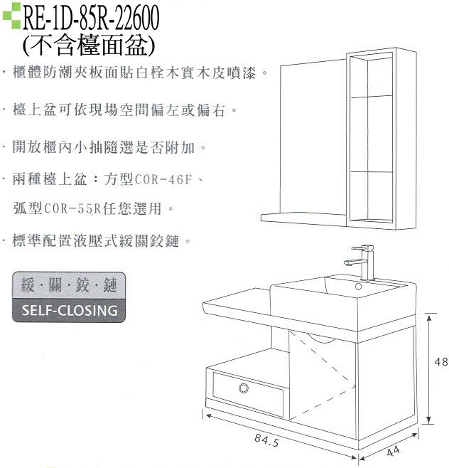 ●RE-1D-85L-22600瑞特浴櫃(不含檯面盆)