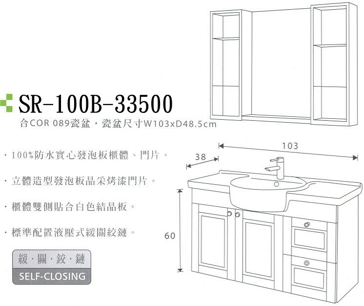 ●SR-100B-233500【方圓浴櫃 雙門+右雙抽】:含COR-089瓷盆,瓷盆尺寸W103*D48.5CM