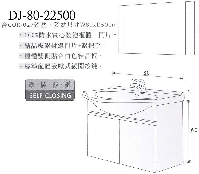 ●DJ-80-22500迪爵浴櫃:含COR-027瓷盆,瓷盆尺寸W80*D50CM