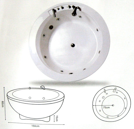 型號:JF-RH106A尺寸:W150*D150*H60 (cm)材質:壓克力電壓:220V 20A馬力:1HP價格:(A) 空缸---$55200 (B) 按摩浴缸---$75200[註] 1. 空缸附落水頭 2. 按摩浴缸附馬達,旋轉式落水頭,鉻噴 3. 五件式龍頭供選配