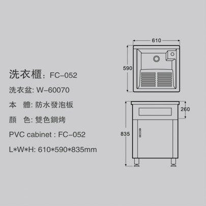 洗 衣 盆:W-60070本 體:防水發泡板顏 色:雙色鋼烤L*W*H :610*590*835mm