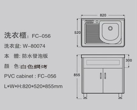 型 號:SO-FC-056 洗衣槽櫃組 洗 衣 盆:W-80074 本 體:防水發泡板顏 色:白色鋼烤L*W*H:820*520*855mm商品備註:此報價為槽櫃組價格 均不含龍頭、浴鏡、配件及展示品。