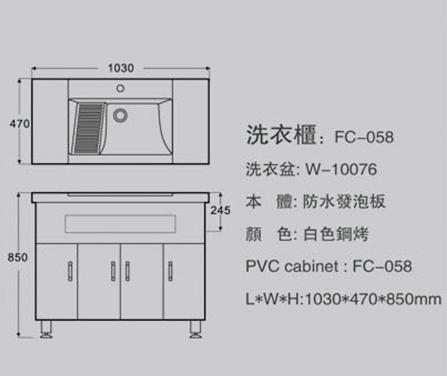 型 號:SO-FC-058 洗衣槽櫃組 洗衣盆:W-10076本 體:防水發泡板顏 色:白色鋼烤L*W*H:1030*470*850mm商品備註:此報價為槽櫃組價格 均不含龍頭、浴鏡、配件及展示品。